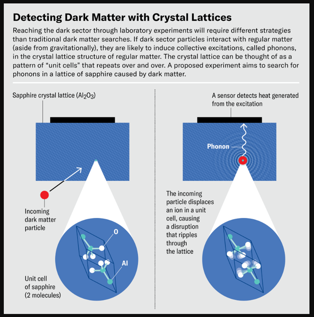 Para comunicações tão raras e fracas entre partículas, as interações entre os constituintes fundamentais da matéria – os núcleons e elétrons nos átomos – tornam-se supremamente importantes. Em outras palavras, para entender como uma partícula de matéria escura pode afetar um átomo típico, devemos considerar as pequenas interações entre átomos organizados em uma rede cristalina dentro de um material.