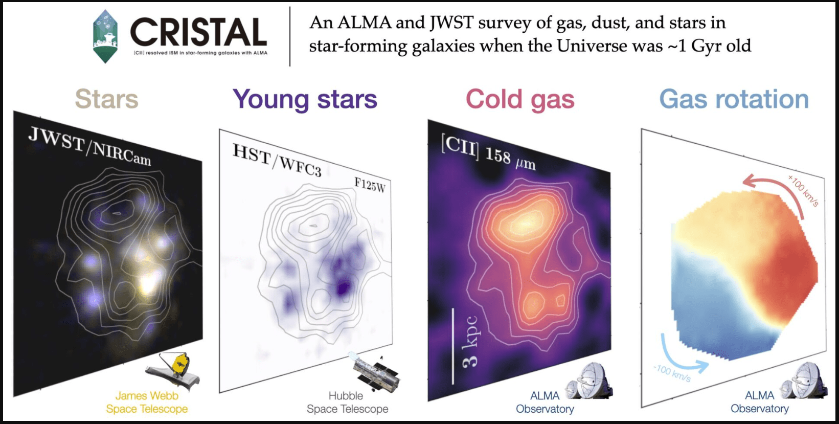 O sistema CRISTAL-13, por sua vez, revela uma morfologia complexa caracterizada por pelo menos sete aglomerados estelares gigantes identificados através de imagens multibanda do telescópio James Webb. O aglomerado mais massivo, situado na região oriental da galáxia, coincide espacialmente com os picos de emissão de carbono ionizado e poeira, apresentando uma razão [CII]/FIR comparável à encontrada em regiões de fotodissociação densas como a Nebulosa de Órion. Em contraste, a região ocidental hospeda um grupo de pelo menos seis aglomerados estelares jovens (com menos de 50 milhões de anos) que mostram uma forte anticorrelação espacial com a emissão de carbono ionizado.
