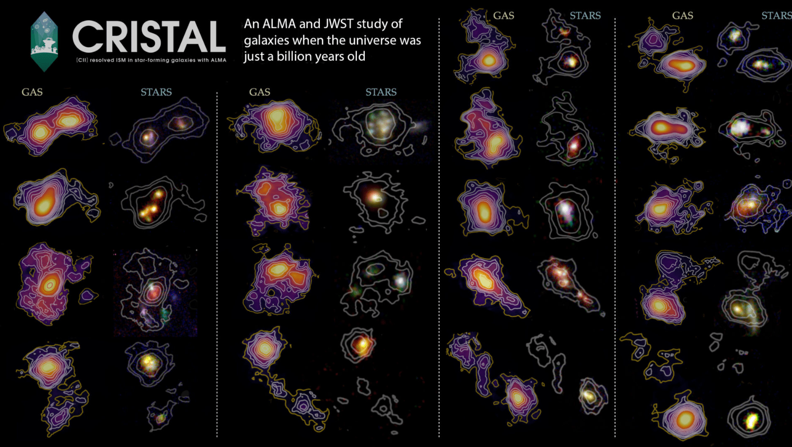 Uma equipe internacional de astrônomos acaba de publicar os resultados mais detalhados já obtidos sobre galáxias que existiam quando o universo tinha apenas um bilhão de anos de idade. O projeto CRISTAL (CII Resolved ISM in STar-forming galaxies with ALMA), realizado com o radiotelescópio ALMA no Chile, oferece uma visão sem precedentes de como as primeiras galáxias se formaram e evoluíram durante os primórdios cósmicos.