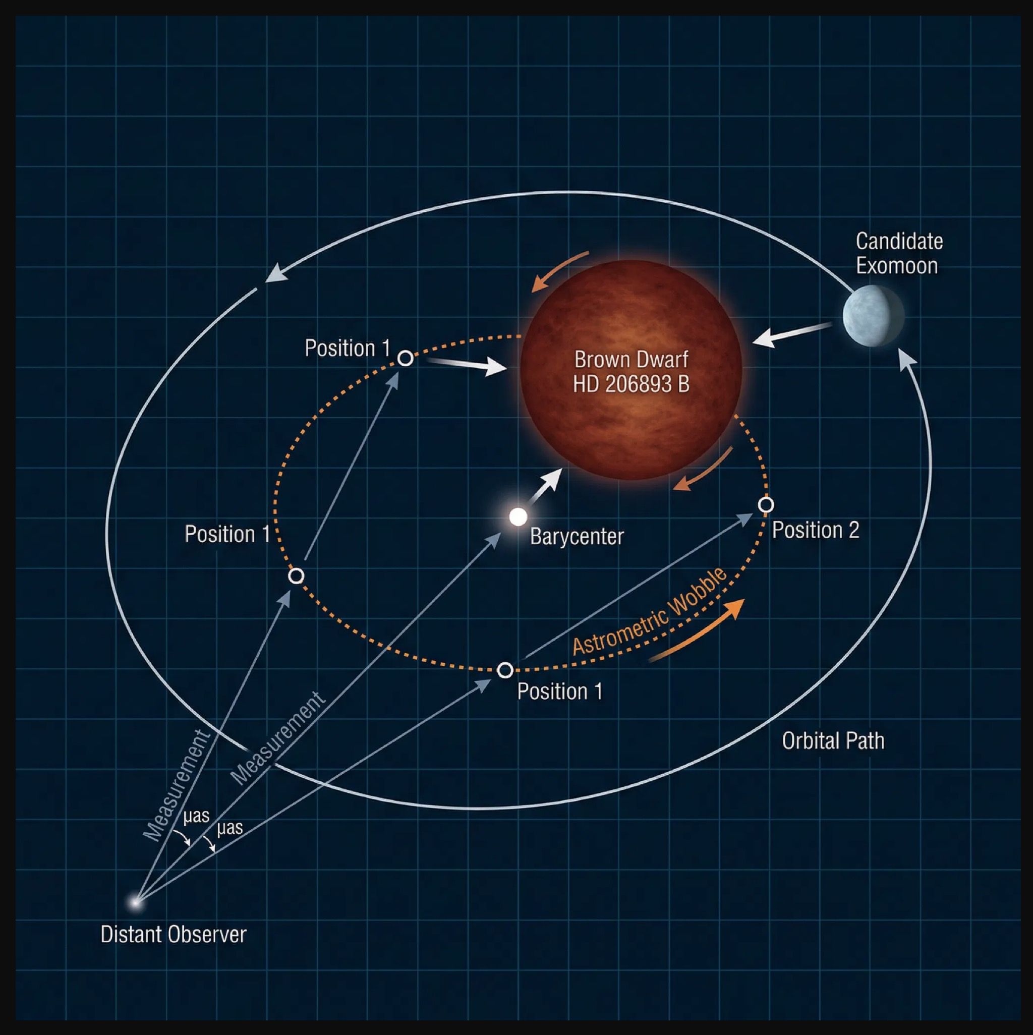 O princípio por trás da busca é direto, mesmo que a execução seja diabólica. Se HD 206893 B tem uma lua, os dois corpos orbitam em torno de um centro de massa comum. O planeta (ou anã marrom, dependendo da classificação) não fica parado enquanto a lua gira ao seu redor; ele também se desloca, descrevendo uma pequena órbita reflexa. O tamanho desse deslocamento depende da razão de massa entre a lua e o hospedeiro e da separação entre os dois. Quanto mais massiva a lua e quanto mais afastada ela estiver, maior o bambolear do hospedeiro — e, portanto, mais fácil de detectar.