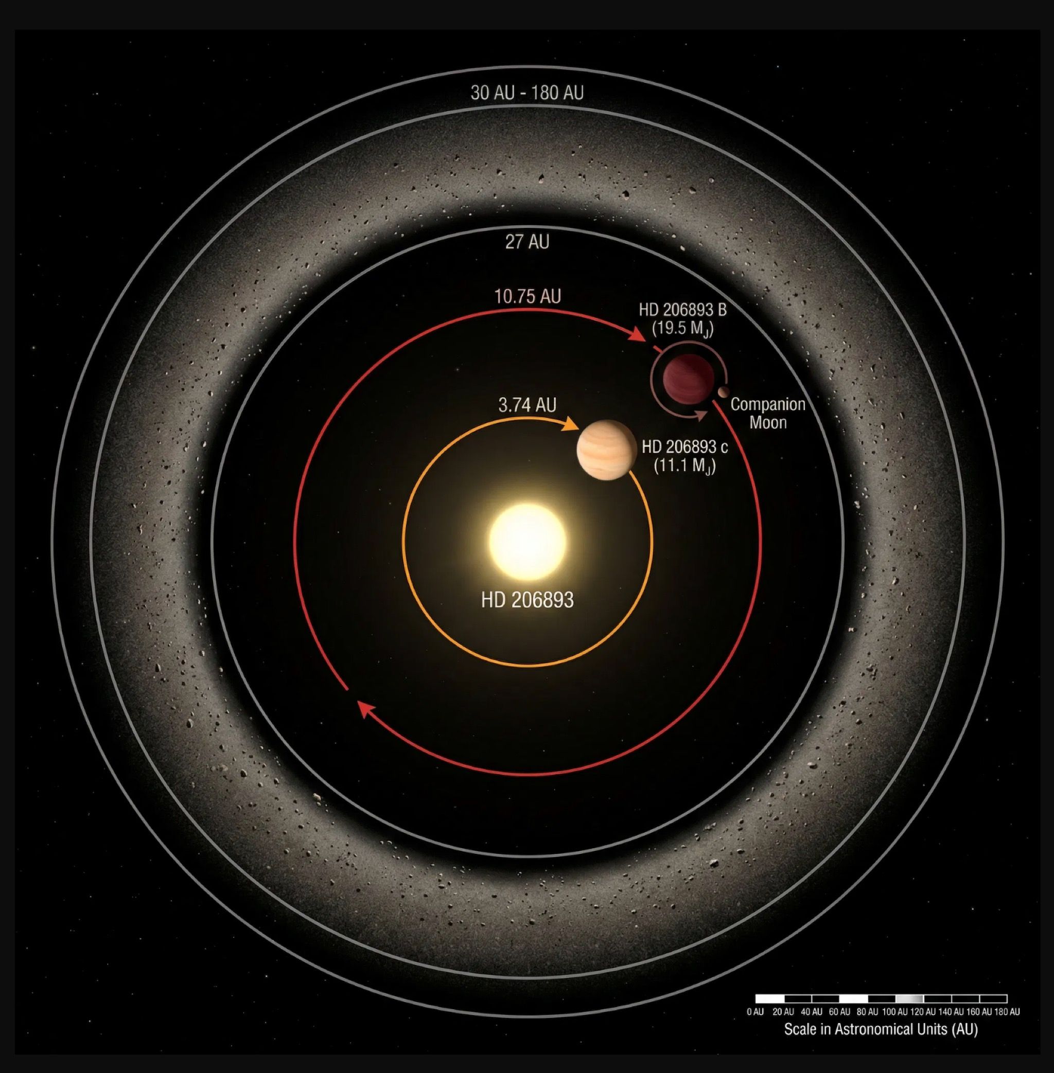 Ao redor de HD 206893, orbitam pelo menos dois companheiros massivos. O mais distante, designado HD 206893 B, foi identificado pela primeira vez em 2017 pelo instrumento SPHERE e situa-se a cerca de 10,75 unidades astronômicas da estrela — um pouco mais longe do Sol do que Saturno. Sua massa, segundo a nova análise orbital da equipe, é de aproximadamente 19,5 massas de Júpiter, o que o coloca na fronteira entre planetas gigantes e anãs marrons. Essa é uma zona cinzenta da classificação astrofísica: dependendo do modelo atmosférico utilizado e da idade assumida para o sistema, a massa de B poderia ser tão baixa quanto 5 massas de Júpiter, conforme estimativas anteriores de Jens Kammerer e colegas em 2021. De todo modo, HD 206893 B exibe características espectrais de um objeto na transição entre os tipos espectrais L e T, com cores no infravermelho próximo extremamente avermelhadas que apontam para a presença de nuvens de poeira em alta altitude em sua atmosfera.