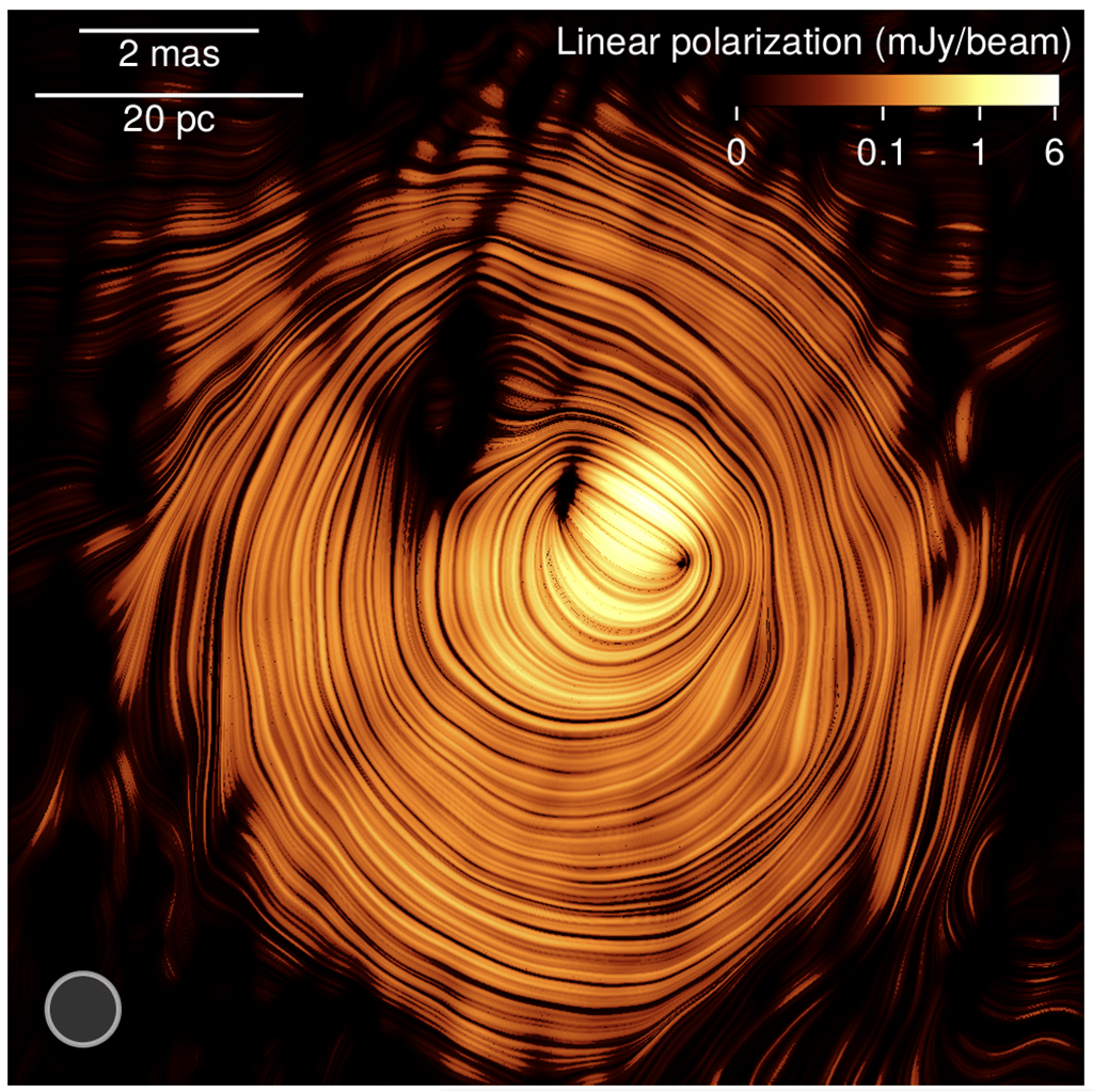 Para visualizar melhor essa estrutura, eles reconstruíram a direção do campo magnético girando o EVPA em 90 graus, assumindo que outros efeitos não estavam distorcendo significativamente a direção observada. O resultado é uma imagem impressionante que os pesquisadores batizaram de “Olho de Sauron” (em referência ao vilão da obra de J. R. R. Tolkien, “O Senhor dos Anéis”), devido à sua natureza “marcante” e semelhança com as ilustrações do olho.