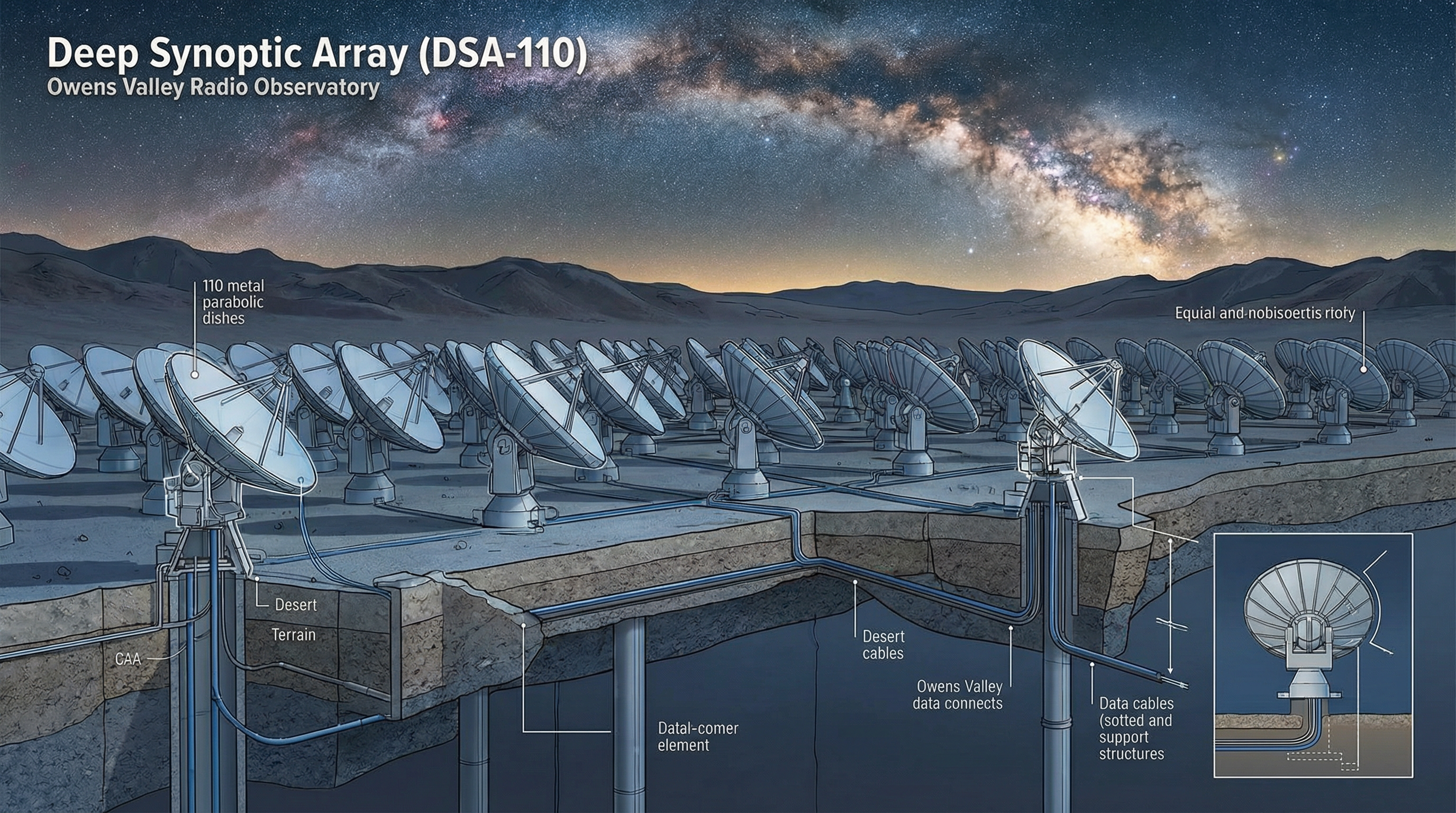 O DSA-110 consiste em 110 antenas parabólicas de 4,5 metros de diâmetro, distribuídas ao longo de uma área de aproximadamente um quilômetro quadrado no deserto da Califórnia. Operando na faixa de frequência de 1,28 a 1,53 gigahertz, o arranjo combina os sinais de todas as antenas para criar um telescópio virtual com uma resolução angular extraordinária. Entre janeiro de 2022 e março de 2024, durante seu período de comissionamento e operação inicial, o DSA-110 descobriu impressionantes 60 novas FRBs. Dessas, 39 tiveram suas galáxias hospedeiras identificadas com sucesso através de observações de acompanhamento com telescópios ópticos e infravermelhos, permitindo a determinação precisa de seus redshifts.