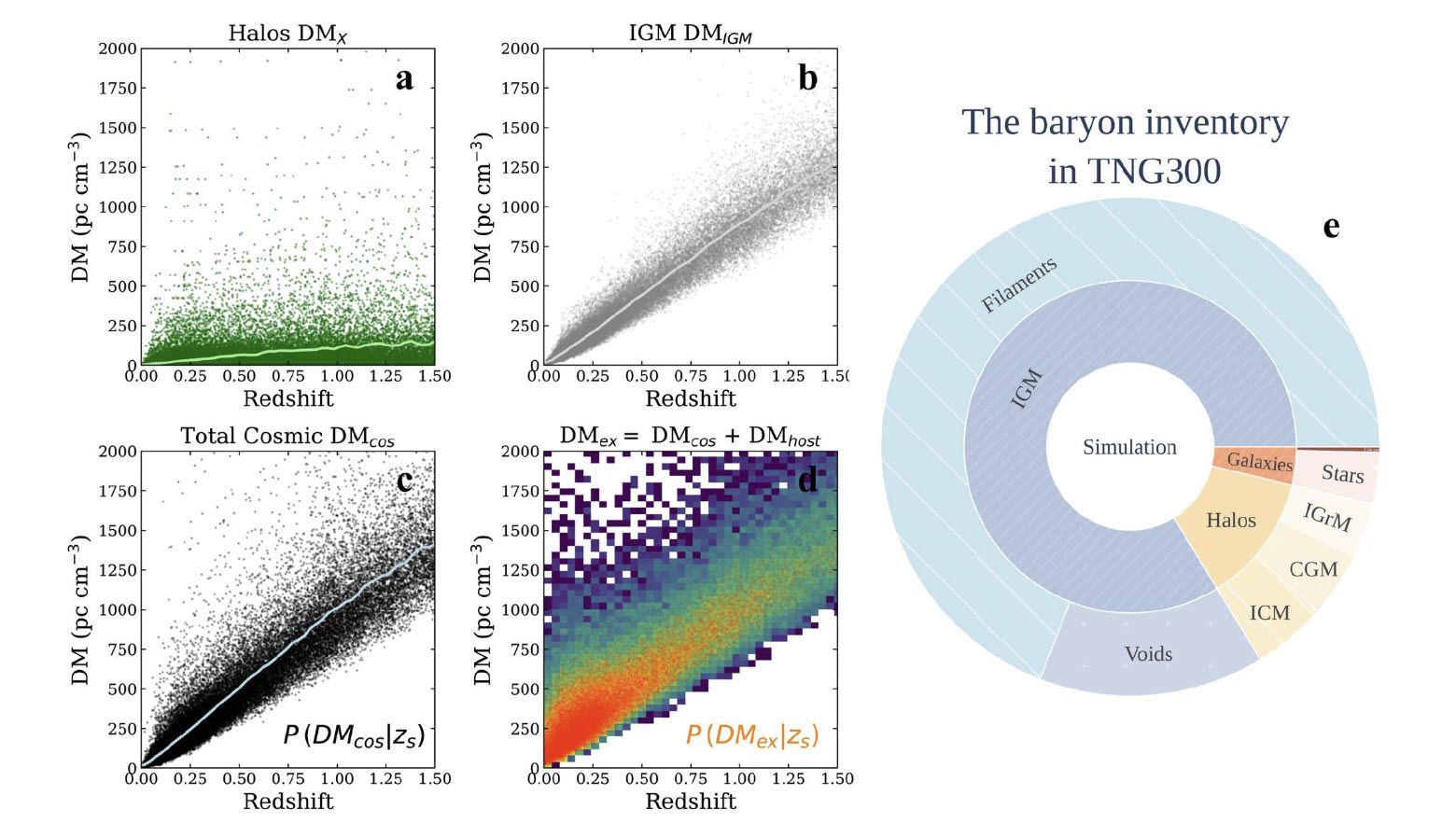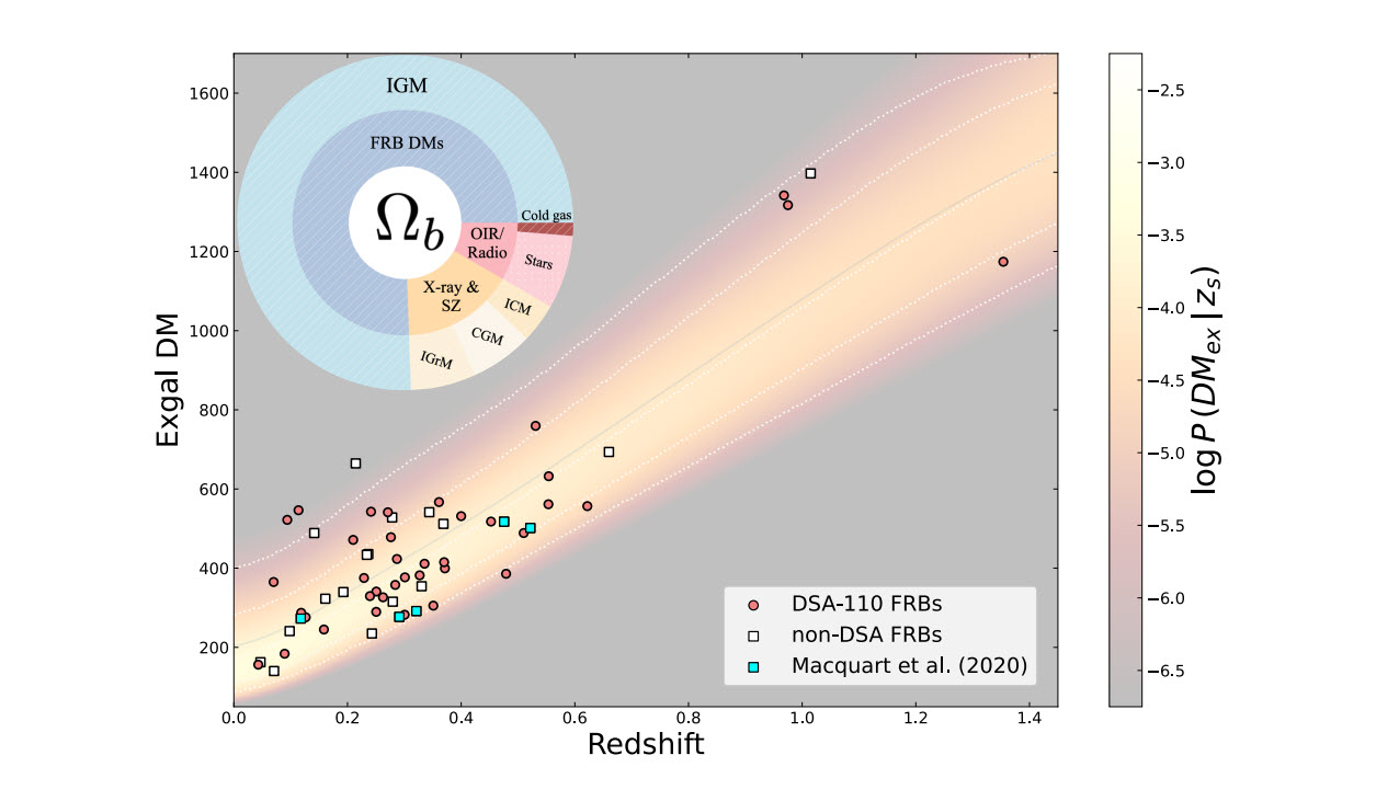 Os pesquisadores também conseguiram colocar limites rigorosos na fração de bárions em diferentes componentes cósmicos. Eles encontraram que aproximadamente 9,2% (com incerteza de mais ou menos 1,6%) dos bárions estão em uma fase ionizada ocupando halos massivos de grupos e aglomerados de galáxias. Apenas cerca de um por cento está em gás neutro frio dentro das galáxias. Isso leva à conclusão de que o meio circungaláctico (CGM) de galáxias individuais não pode abrigar uma fração substancial dos bárions do Universo. A análise global está em excelente acordo com estudos detalhados de linhas de visada individuais de FRBs que intersectam halos de galáxias em primeiro plano.