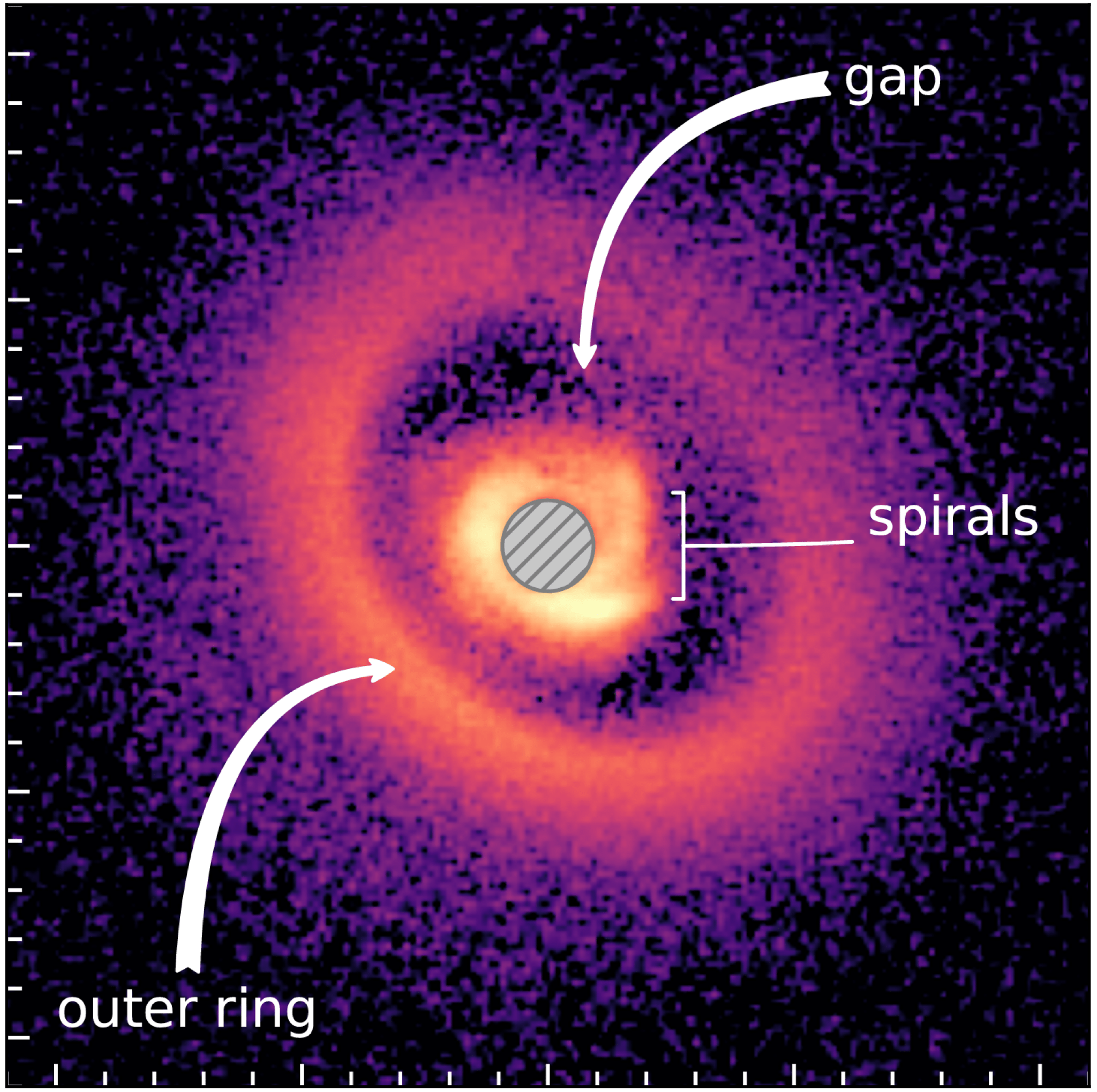 As observações com o instrumento SPHERE revelaram pela primeira vez a estrutura detalhada do disco circumestelar em luz espalhada, proporcionando uma visão sem precedentes da arquitetura deste sistema em formação. O que os astrônomos descobriram superou todas as expectativas: um disco com uma morfologia extraordinariamente complexa que sugere fortemente a presença de um ou mais planetas em formação.