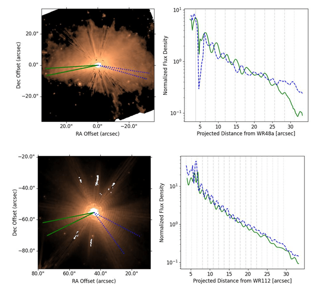 As novas imagens do James Webb de WR112 confirmaram não apenas a presença das estruturas de poeira previstas pelos modelos, mas também revelaram detalhes sobre como esta poeira se propaga pelo meio interestelar circundante. O movimento próprio da poeira, medido através da comparação de imagens obtidas em diferentes épocas, mostrou que as partículas se movem a velocidades comparáveis às velocidades terminais dos ventos estelares das estrelas Wolf-Rayet, tipicamente entre 1.500 e 3.000 quilômetros por segundo.