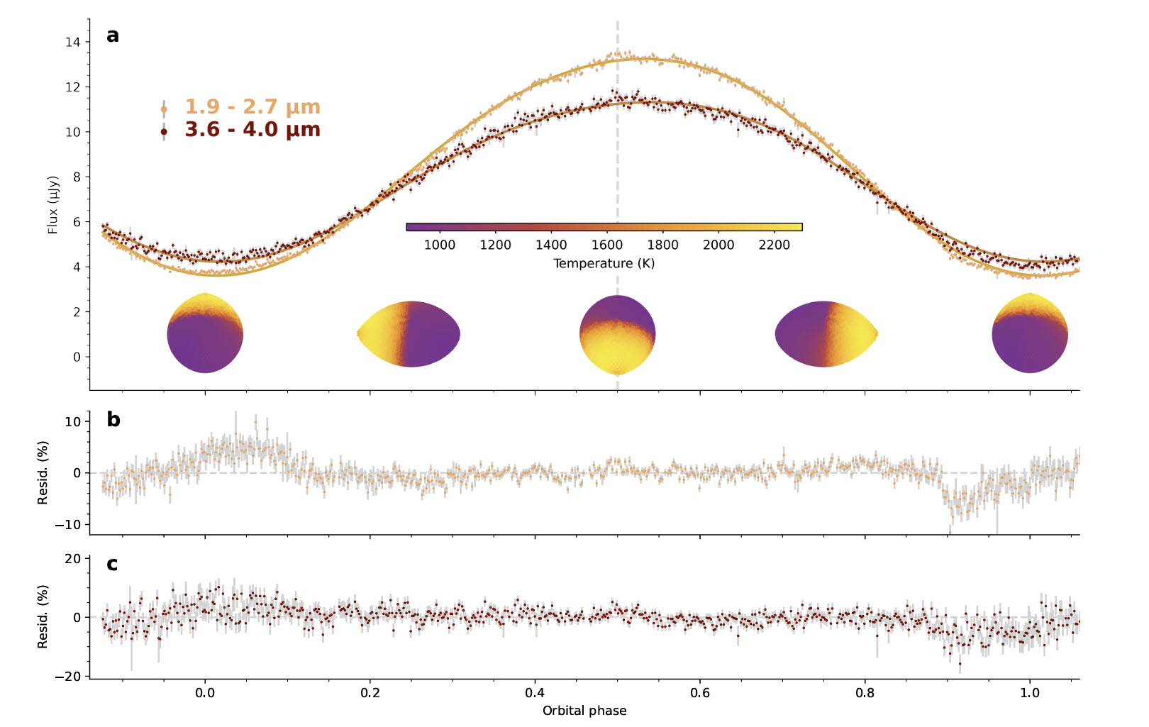 A temperatura de brilho do planeta varia drasticamente ao longo de sua órbita, oscilando entre 900 K no lado noturno e 2300 K no lado diurno. Esta é uma das maiores variações de temperatura já registradas para um exoplaneta e reflete a eficiência com que o calor é redistribuído pela atmosfera. No lado diurno, a atmosfera é aquecida a temperaturas comparáveis às de uma fornalha industrial, enquanto o lado noturno, embora mais frio, ainda é quente o suficiente para derreter a maioria dos metais. A equipe também observou variações de brilho de órbita para órbita, sugerindo que a atmosfera do planeta pode ser dinâmica e variável, possivelmente devido a erupções ou flutuações na atividade do pulsar.