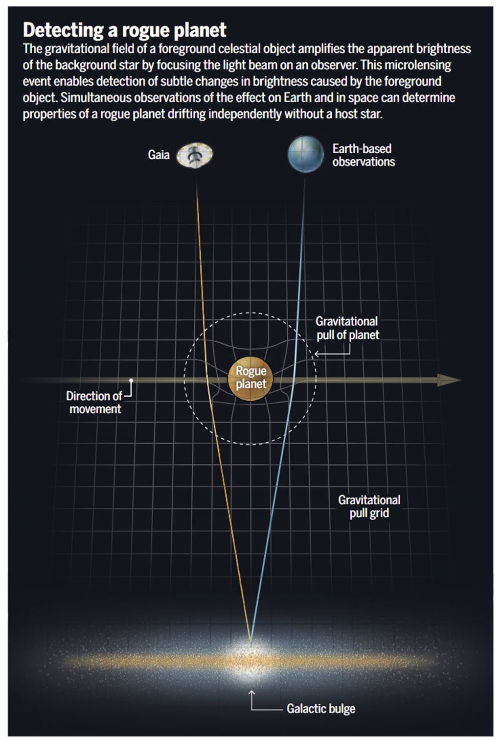 A detecção foi possível graças a uma técnica sofisticada chamada microlente gravitacional, prevista pela Teoria da Relatividade Geral de Einstein. Quando um objeto massivo, como um planeta, passa quase perfeitamente alinhado entre nós e uma estrela distante, sua gravidade curva o espaço-tempo ao seu redor, atuando como uma lente de aumento cósmica. Isso faz com que a luz da estrela distante seja amplificada temporariamente, criando um aumento característico no brilho observado da Terra. No caso deste planeta órfão, o evento de amplificação durou apenas 0.842 dias, e foi capturado por uma rede global de telescópios (KMTNet e OGLE) que monitoram continuamente milhões de estrelas em busca desses eventos raros. A combinação de dados terrestres com observações do satélite Gaia permitiu medir com precisão a massa e a distância do objeto.