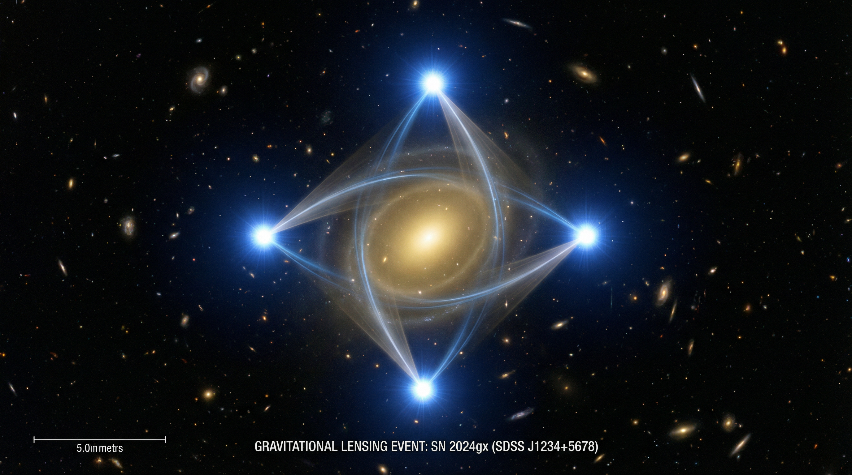A lente gravitacional é um fenômeno previsto pela Teoria da Relatividade Geral de Albert Einstein. Segundo esta teoria, objetos massivos como galáxias não apenas atraem outros objetos através da gravidade, mas também curvam o próprio tecido do espaço-tempo ao seu redor. Quando a luz de uma fonte distante (como nossa supernova) passa perto de um objeto massivo (uma galáxia em primeiro plano), ela segue essa curvatura do espaço-tempo, resultando em uma deflexão de sua trajetória. Se o alinhamento entre a fonte distante, a galáxia lente e o observador na Terra for suficientemente preciso, múltiplas trajetórias de luz podem conectar a fonte ao observador, criando múltiplas imagens do mesmo objeto – exatamente como vemos com a SN 2025wny, que aparece como quatro imagens distintas dispostas em padrão de cruz.