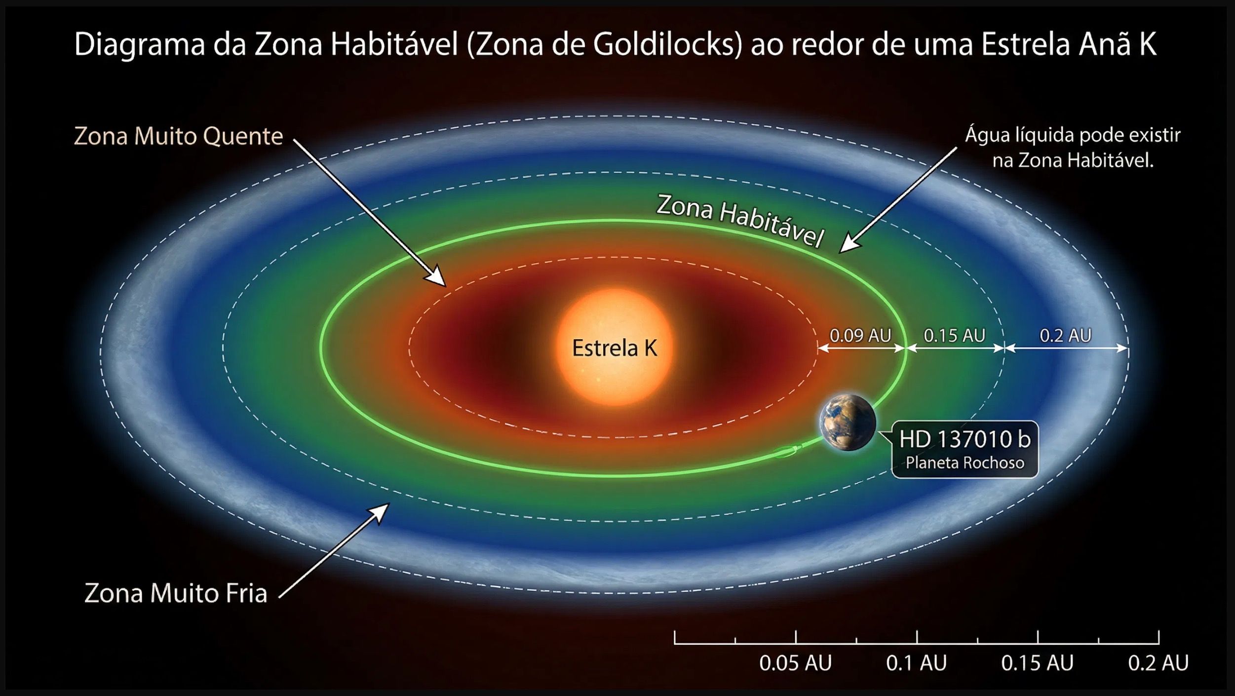 Próximo em órbita, HD 137010 b está a cerca de 0,12 anos-luz de sua estrela central, aninhada próximo ao ponto ideal onde a água pode um dia fluir. Ao redor de qualquer sol, há uma faixa — nem muito quente, nem muito fria — onde a vida pode possivelmente criar raízes. Esse trecho ao redor da estrela marca o que os astrônomos chamam de zona habitável. Para este mundo em particular, estar ligado a uma estrela do tipo K mais suave ajuda; essas estrelas mais frias tendem a brilhar mais, mas por mais tempo do que suas contrapartes semelhantes ao Sol. Com a sobrevivência mais longa vêm mais chances – para que as configurações de estrelas mudem de forma, lentamente se desdobrando possibilidades de vida em vastas extensões de ponteiros de relógio que continuam a funcionar.