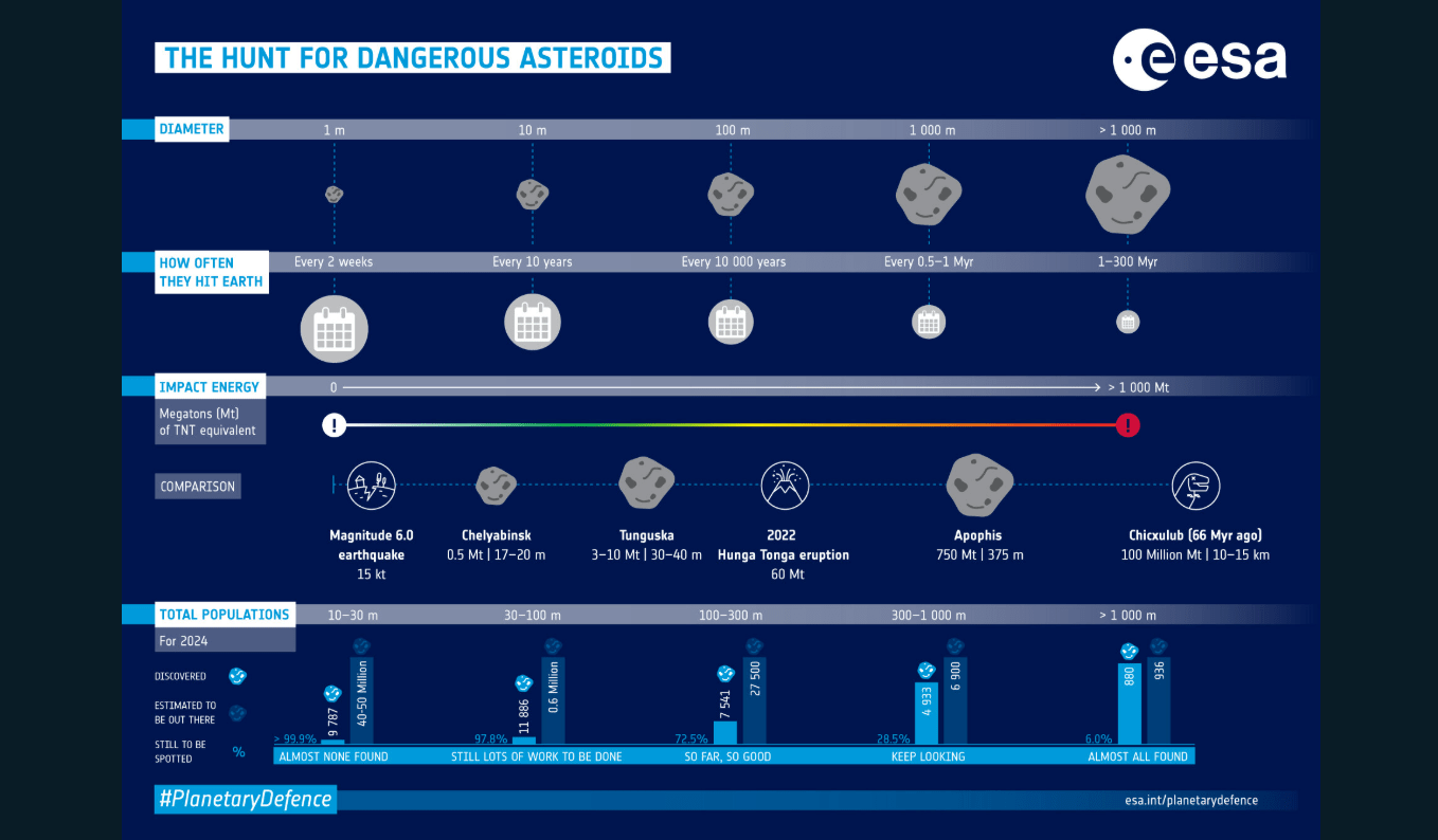 Felizmente, nenhum dos 40.000 asteroides próximos à Terra atualmente conhecidos representa uma ameaça para o futuro previsível. Esta é uma notícia extraordinariamente positiva, mas não motivo para complacência. Os modelos científicos indicam que muitos milhares de asteroides potencialmente perigosos permanecem não descobertos, particularmente na categoria de tamanho médio que poderia causar devastação regional significativa.
