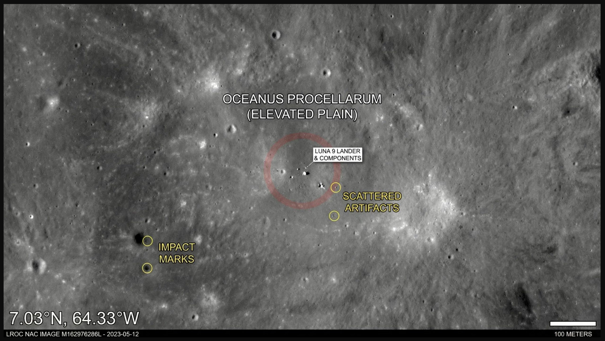 A distribuição espacial dos objetos detectados encaixa no que se sabe sobre a sequência de pouso da Luna 9. Os registros históricos descrevem que a espaçonave principal ejetou seus módulos laterais e lançou a cápsula envolta em airbags a cerca de cinco metros da superfície. As pétalas estabilizadoras e antenas foram implantadas minutos depois do toque, enquanto o estágio de voo, sem propulsão, deve ter impactado entre cem e duzentos metros adiante. As múltiplas detecções do YOLO-ETA dentro desse raio de distância poderiam corresponder ao módulo pousado e seus componentes ejetados. Dois pontos escuros incomuns, de quarenta e sessenta metros ao sul-sudoeste da detecção principal, coincidem com pequenas crateras de cinco e sete metros visíveis apenas sob ângulos solares elevados. Os pesquisadores especulam que essas marcas poderiam ser os sítios de impacto dos módulos laterais da sonda, que pesavam cerca de 150 quilogramas cada e teriam caído em queda livre balística a quase quinhentos metros por segundo, fragmentando-se e alterando significativamente o albedo do regolito ao redor.