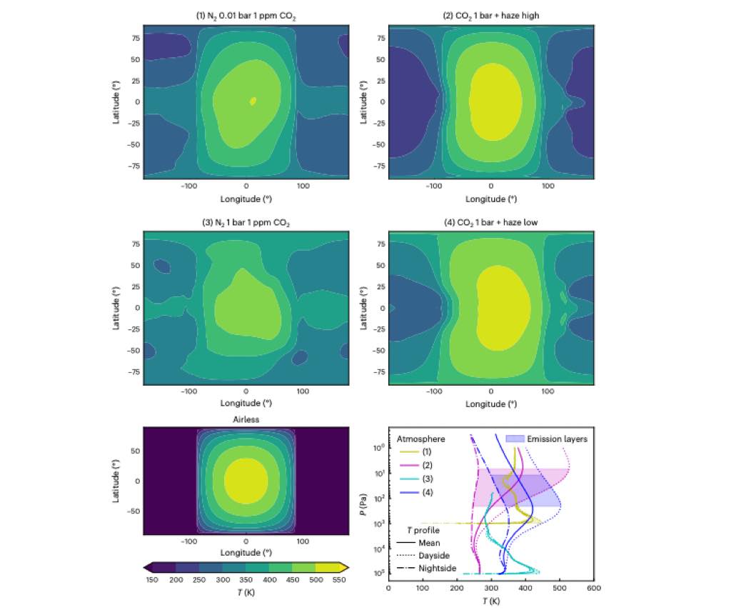 Para interpretar o que esses números significam em termos físicos, a equipe recorreu a duas classes complementares de modelagem. De um lado, o modelo climático-fotoquímico dia-noite do Virtual Planetary Laboratory da Universidade de Washington, operando em modo bidimensional com advecção camada por camada entre os hemisférios iluminado e escuro. De outro, o Generic Planetary Climate Model, um modelo de circulação global tridimensional desenvolvido no Laboratoire de Météorologie Dynamique em Paris, capaz de resolver a estrutura espacial completa da atmosfera incluindo ventos super-rotacionais, formação de nuvens e transporte convectivo. Ambos foram alimentados com uma gama de composições atmosféricas plausíveis — nitrogênio puro, oxigênio puro, dióxido de carbono denso, vapor d’água dominante, misturas com gases-traço — em pressões que variaram de um centésimo de bar até dez bares.