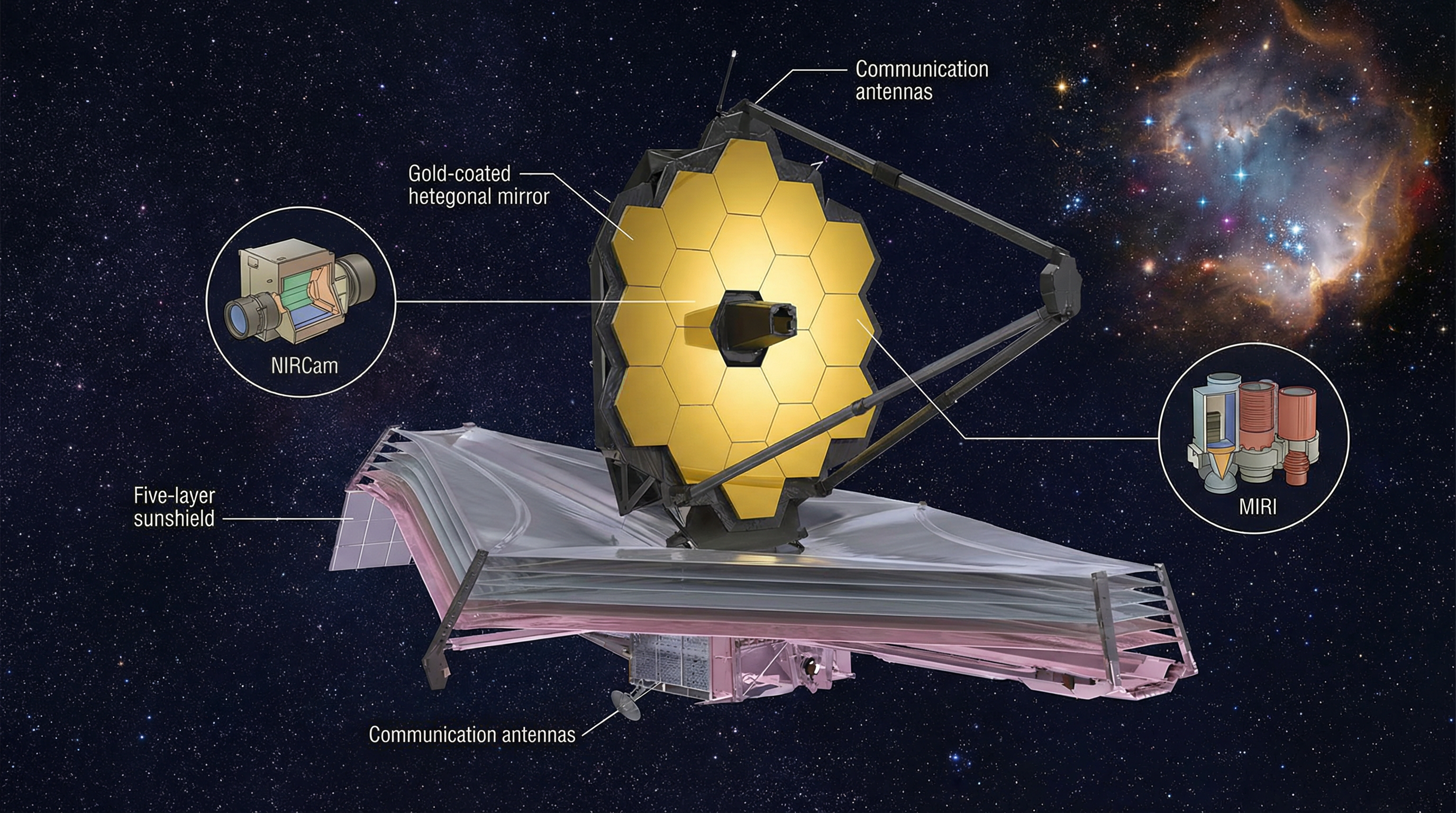 A diferença fundamental está nos comprimentos de onda que cada telescópio observa. O Hubble opera principalmente em luz visível e ultravioleta – os mesmos tipos de luz que nossos olhos detectam. Embora isso produza imagens bonitas, a luz visível tem uma grande desvantagem: ela é facilmente bloqueada e espalhada por partículas de poeira interestelar. É como tentar ver através de uma neblina densa. O James Webb, por outro lado, foi projetado especificamente para observar em comprimentos de onda infravermelhos, que podem penetrar através dessas nuvens de poeira com muito mais facilidade. Além disso, o espelho primário do Webb tem 6,5 metros de diâmetro – quase três vezes maior que o do Hubble – o que lhe dá uma capacidade muito maior de coletar luz fraca. Isso significa que o Webb pode detectar estrelas jovens de baixa massa e anãs marrons que estão completamente escondidas do Hubble, revelando uma população estelar inteira que antes era invisível.