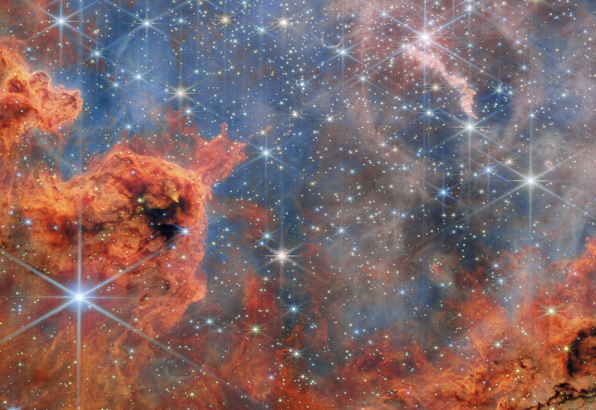 As cores vibrantes que você vê não são exatamente como seus olhos veriam se você estivesse lá. O James Webb observa o universo em comprimentos de onda infravermelhos, que são invisíveis ao olho humano. Para tornar esses dados visíveis e cientificamente úteis, os astrônomos atribuem cores específicas a diferentes comprimentos de onda infravermelhos. Os tons vermelhos e laranjas intensos representam emissões de comprimentos de onda mais longos (infravermelho médio), capturados pelo instrumento MIRI, que revelam poeira aquecida e moléculas orgânicas complexas. Os azuis e brancos representam comprimentos de onda mais curtos (infravermelho próximo), capturados pela NIRCam, que mostram a luz das estrelas. Essa técnica de “falsa cor” não apenas cria imagens visualmente impressionantes, mas também permite aos cientistas distinguir diferentes componentes físicos da nebulosa e entender a temperatura, composição química e dinâmica da região.