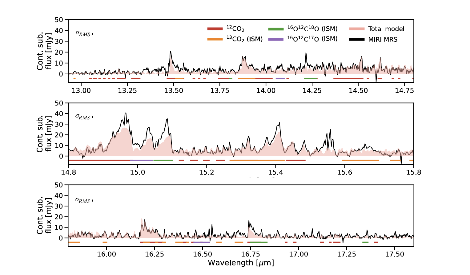 Ao analisar o espectro infravermelho de XUE 10, capturado pelo instrumento MIRI do JWST, a equipe de astrônomos se deparou com uma assinatura química dominada por uma emissão de dióxido de carbono (CO₂) extraordinariamente brilhante. Mas a surpresa não parou por aí. Pela primeira vez na história da astronomia, foram detectados simultaneamente e com alta significância (>5σ) quatro isótopos diferentes de CO₂ em um disco protoplanetário: o comum ¹²CO₂, e seus “primos” mais raros, ¹³CO₂, ¹⁶O¹²C¹⁸O e ¹⁶O¹²C¹⁷O.