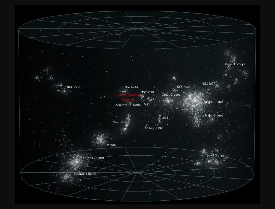 - O Aglomerado de Virgem: A estrutura próxima mais dominante é o Aglomerado de Galáxias de Virgem. Localizado a apenas 50-60 milhões de anos-luz de distância, ele contém mais de mil galáxias comparáveis em tamanho e massa à Via Láctea. O Aglomerado de Virgem é a principal fonte de massa em nosso Universo próximo. Nossa própria localização em Laniakea fica nos arredores do Aglomerado de Virgem.