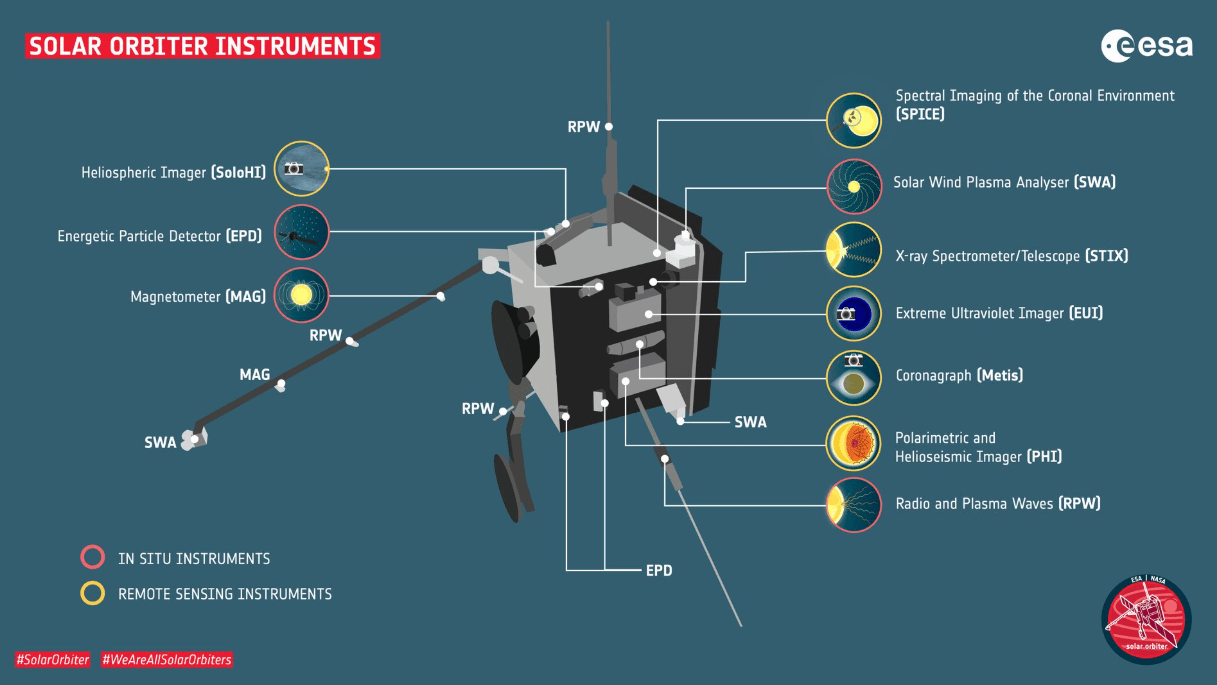 - RPW (Radio and Plasma Waves): Este instrumento é fundamental para identificar e caracterizar explosões de rádio tipo III, que funcionam como um elo entre os eventos de partículas in situ detectados pela Solar Orbiter e suas fontes solares. As medições de campos elétricos cobrem a faixa de frequência de 4 kHz a 16 MHz.
