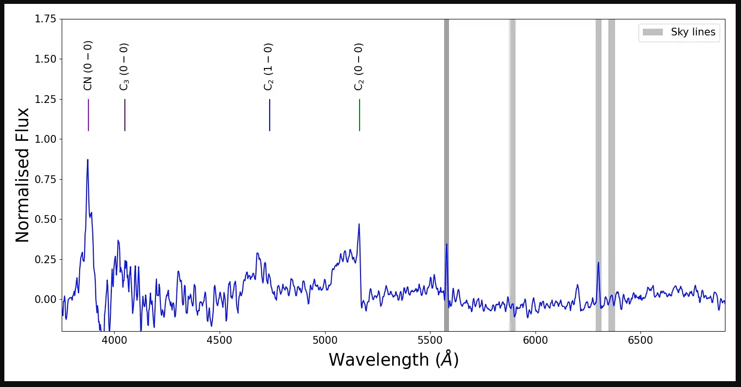 Contudo, a verdadeira revelação veio da espectroscopia. Esta técnica é a chave para desvendar a composição química de objetos celestes distantes. A luz coletada pelo telescópio foi direcionada para um instrumento especializado chamado LISA (LIght Spectrograph and imager). Dentro do LISA, a luz do cometa foi passada através de uma grade de difração, que funciona como um prisma de alta tecnologia, decompondo a luz em seus comprimentos de onda constituintes. O espectro resultante funciona como uma “impressão digital” química inequívoca. Ao analisar o espectro do 3I/ATLAS, a equipe do PRL identificou, com alta confiança, as assinaturas proeminentes de três moléculas baseadas em carbono que são a marca registrada dos cometas: Cianogênio (CN), Carbono Diatômico (C2) e Tricarbono (C3). Estas são as famosas “bandas de Swan”, onipresentes nos espectros de cometas do nosso Sistema Solar. O Cianogênio (CN) é um radical formado pela quebra de moléculas mais complexas, como o cianeto de hidrogênio (HCN), pela luz solar. Sua presença indica a existência de compostos nitrogenados no núcleo. As moléculas de C2 e C3 são cadeias de carbono puro, formadas pela fotodissociação de hidrocarbonetos mais complexos, como o acetileno (C2H2) e o metano (CH4). A detecção dessas três espécies em um cometa interestelar é uma confirmação direta de que a química orgânica complexa, um ingrediente essencial para a vida, está presente em corpos formados em outros sistemas estelares.