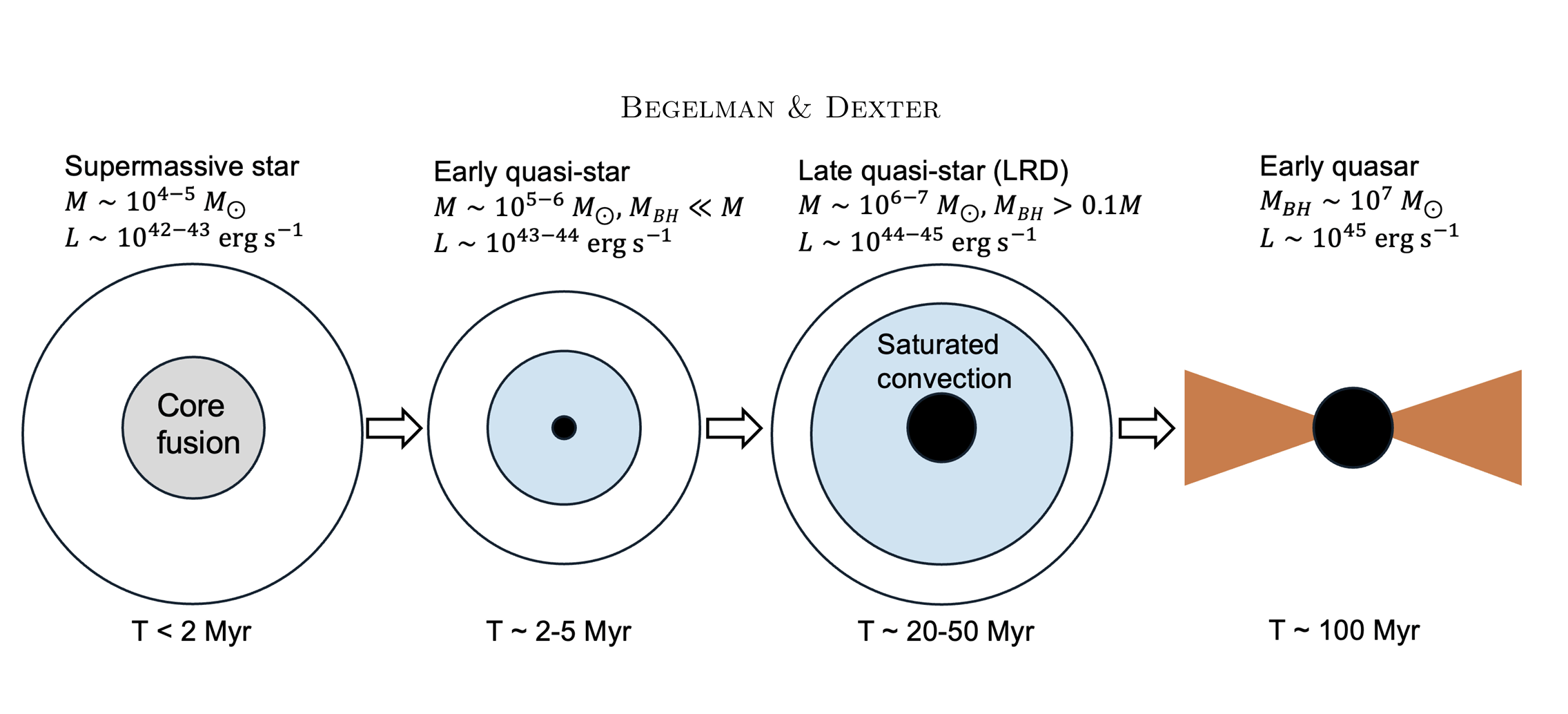 A energia liberada durante este colapso inicial é insuficiente para desvincular o envelope da estrela supermassiva, que em vez disso se expande e se estabelece em uma configuração convectiva. A taxa de acreção interna no buraco negro se ajusta de forma que libere o limite de Eddington correspondente à massa de todo o envelope, não apenas à do buraco negro central.