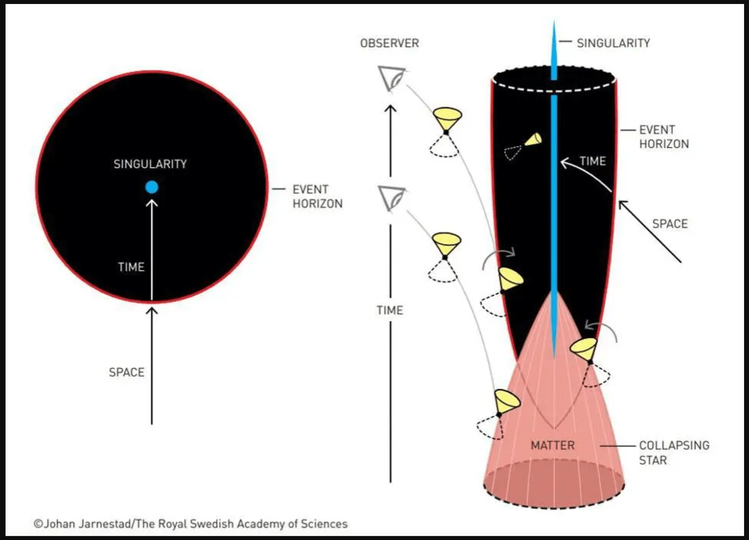 O trabalho pioneiro de Roger Penrose, que lhe rendeu o Prêmio Nobel de Física em 2020, demonstrou que a formação de buracos negros é uma consequência robusta e inevitável da relatividade geral. Penrose provou matematicamente que, sob certas condições, o colapso gravitacional de uma estrela massiva levará inevitavelmente à formação de uma singularidade – um ponto onde a densidade se torna infinita e as leis conhecidas da física deixam de funcionar [2].