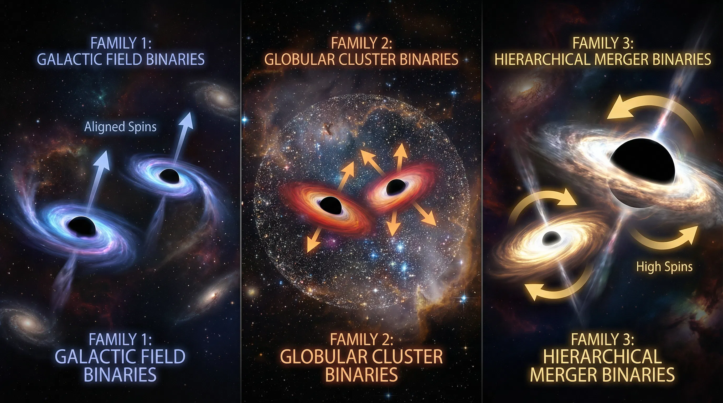 Cada colisão entre dois buracos negros é, na sua essência, uma carta enviada do passado. Uma carta escrita em ondas gravitacionais — aquelas perturbações no tecido do espaço-tempo que o físico Albert Einstein previu em 1916 e que a humanidade só aprendeu a ler um século depois, quando os detectores do LIGO captaram, pela primeira vez, o eco de dois buracos negros se fundindo a mais de um bilhão de anos-luz de distância. Desde aquele 14 de setembro de 2015, o universo nunca mais foi o mesmo para a astronomia. Agora, uma década de observações depois, com mais de 150 detecções acumuladas no catálogo do LIGO-Virgo-KAGRA, um grupo de pesquisadores da Northwestern University, da Universidade de Oklahoma e do Adler Planetarium acabou de decifrar algo que estava escondido nessa coleção de sinais: os buracos negros binários que chegam até nossos detectores não formam uma população uniforme. Eles vêm de lugares diferentes, de histórias diferentes, de mortes estelares com enredos completamente distintos. E um estudo publicado em março de 2026 no repositório científico arXiv demonstra, pela primeira vez com este grau de precisão estatística, que existem exatamente três famílias de buracos negros binários, cada uma portando as marcas de um mecanismo de formação específico — três capítulos diferentes da mesma história cósmica.