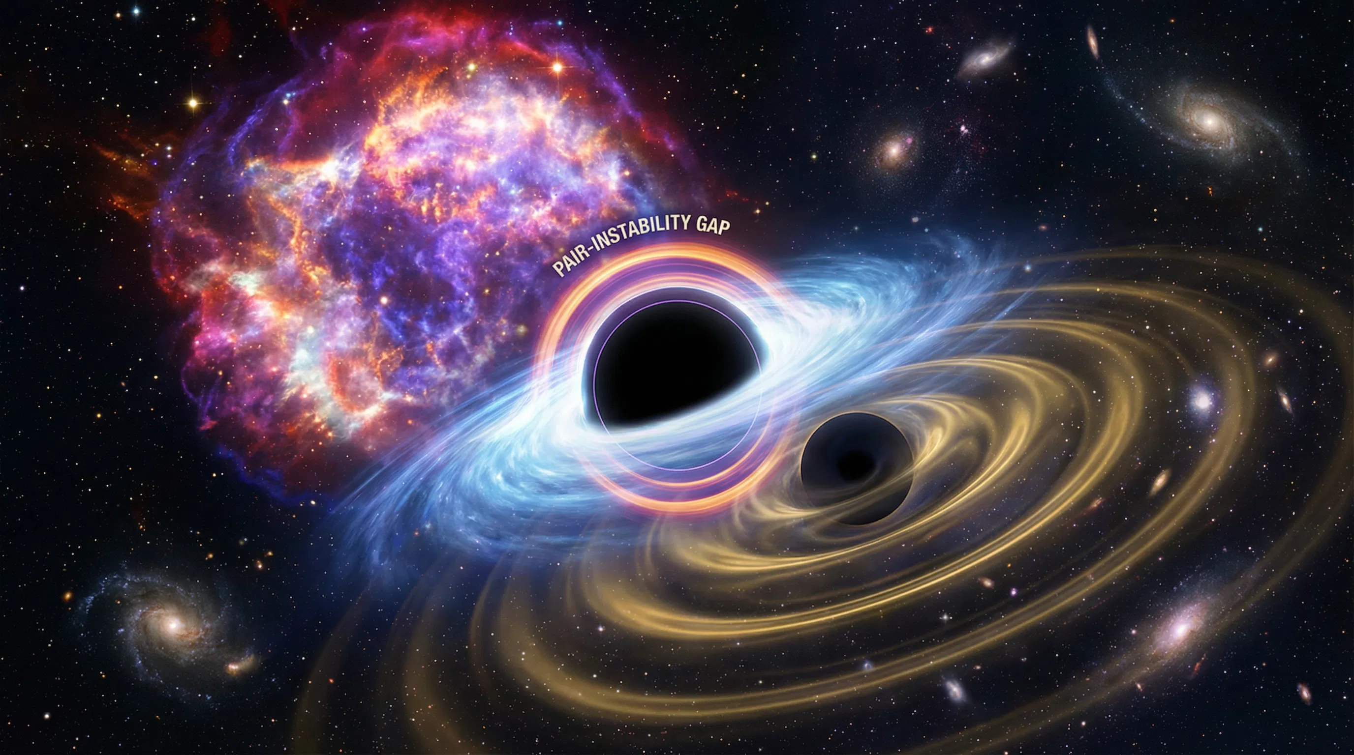 O processo de instabilidade de pares merece uma explicação cuidadosa, porque é um dos elementos mais fundamentais de toda esta história. Estrelas com massas entre aproximadamente 130 e 250 massas solares sofrem, nas fases finais de sua vida, uma instabilidade termodinâmica relacionada à criação de pares de elétron-pósitron no núcleo. Essa criação de pares reduz a pressão de radiação que sustenta a estrela contra o colapso gravitacional, desencadeando uma explosão termonuclear catastrófica — a supernova de instabilidade de pares — que pode destruir completamente a estrela sem deixar nenhum remanescente compacto. O resultado é que buracos negros formados diretamente pelo colapso estelar não podem ter massas no intervalo aproximado de 50 a 130 massas solares — essa região é chamada de lacuna de instabilidade de pares. Buracos negros hierárquicos, porém, podem perfeitamente ter massas nessa região proibida, porque eles não foram formados por colapso estelar — eles são filhos de fusões.