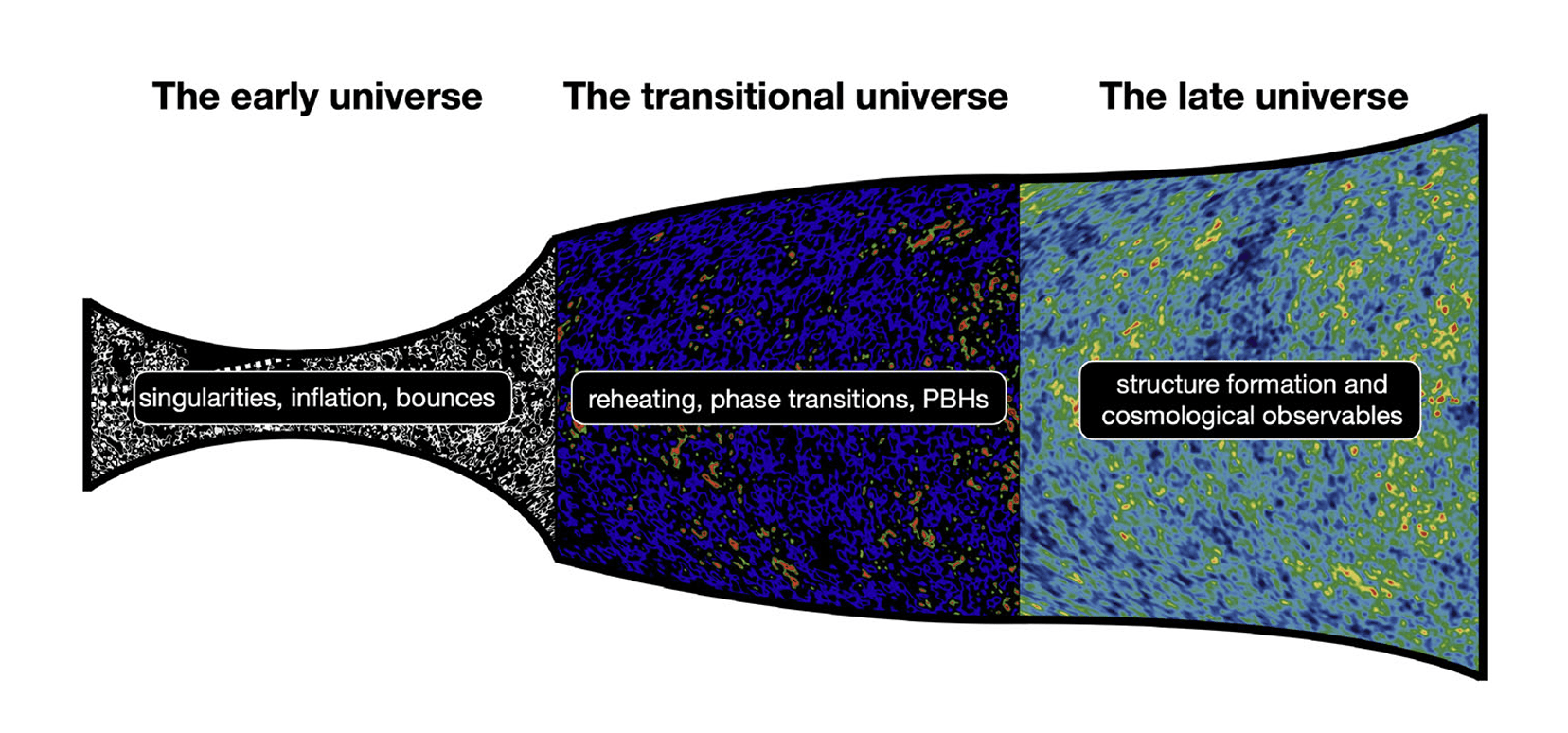 O estudo divide as aplicações da relatividade numérica na cosmologia em três grandes eras, seguindo a linha do tempo do universo: