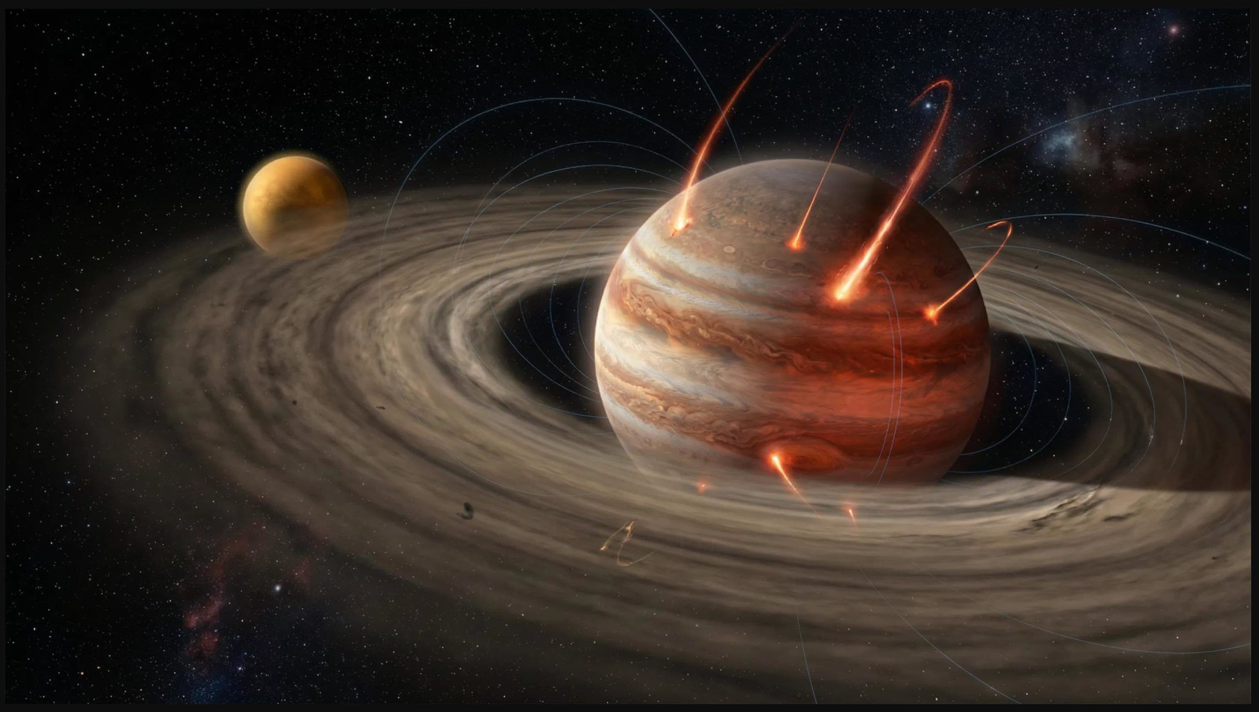 Para compreender o que isso significa, é preciso recuar no tempo e imaginar o sistema solar com menos de dez milhões de anos. Júpiter e Saturno já tinham acumulado a maior parte de suas massas, mas ainda estavam envoltos em discos de gás que rotacionavam ao seu redor — os chamados discos circuplanetários, ou CPDs, na sigla em inglês. Esses discos são as fábricas de luas: dentro deles, pequenos corpos sólidos chamados de protossatélites se formam, crescem por colisões e acreção de material, e gradualmente migram em direção ao planeta central, empurrados pelas forças exercidas pelo próprio gás do disco. A migração orbital, em geral, é um processo inexorável: um protossatélite em formação tende a espiralar para dentro, perdendo momento angular para o gás que o circunda, e eventualmente caindo sobre o planeta que deveria orbitar. Que as luas galileanas existam hoje é, por si só, uma prova de que algo interrompeu essa migração mortal ao redor de Júpiter. Ao redor de Saturno, os dados sugerem que algo bem diferente aconteceu.