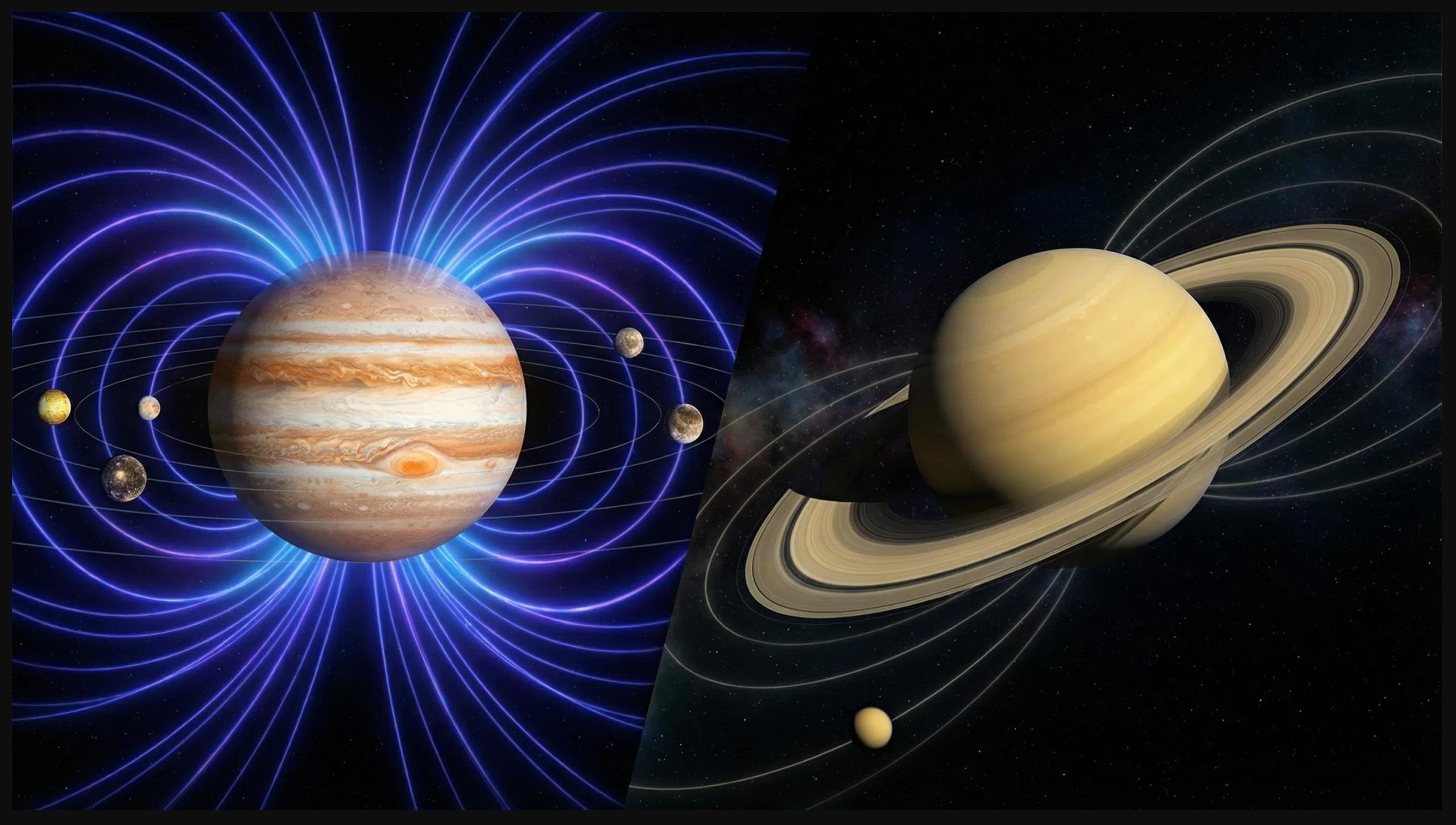 Olhando para o céu noturno de uma ilha no oceano Pacífico, longe das luzes da cidade, é possível ver Júpiter como um ponto de luz estável e brilhante — quase uma estrela que se recusou a acender. O que os olhos não alcançam é o que orbita em torno desse gigante: quatro luas grandes, descobertas por Galileu em 1610, que se movem em uma coreografia de precisão matemática tão elegante que gerou séculos de debate científico sobre sua origem. Três dessas luas — Io, Europa e Ganimedes — estão presas em uma ressonância gravitacional conhecida como ressonância de Laplace, na proporção de 4:2:1 entre seus períodos orbitais, como engrenagens de um relógio cósmico que jamais atrasa. A quarta, Calisto, gira um pouco mais distante, fora dessa harmonia perfeita. Saturno, o vizinho mais próximo de Júpiter no sistema solar externo, conta uma história completamente diferente: um único satélite de grande porte, Titã, orbita em uma órbita relativamente distante, enquanto as regiões internas do planeta são dominadas por pequenas luas e pelos famosos anéis. Por que dois planetas tão parecidos em tamanho — e com massas que diferem apenas por um fator de três — geraram arquiteturas de satélites tão radicalmente distintas? Por décadas, essa pergunta ficou sem resposta convincente. Agora, um estudo publicado na revista Nature Astronomy por pesquisadores japoneses e chineses oferece a explicação mais completa e matematicamente rigorosa já proposta: a chave está no campo magnético.