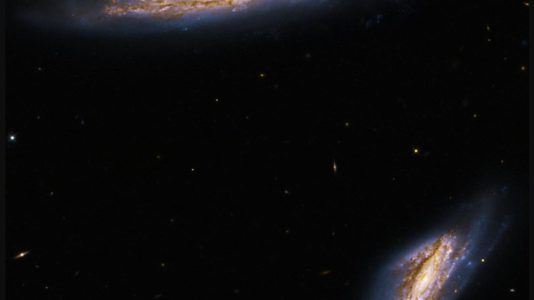 Uma bela imagem do Telescópio Espacial Hubble mostra duas galáxias espirais peculiares. As duas galáxias são conhecidas de forma coletiva como Arp 303, e o par está...