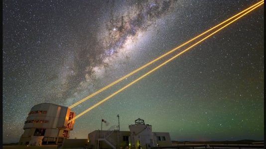 Nesta bela foto do ESO podemos ver quatro poderosos raios laser sendo emitidos pelo Telescópio Principal 4, ou Yepun, do Very Large Telescope (VLT) do ESO, no deserto...