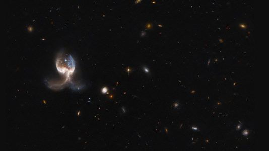 Duas galáxias em fusão no sistema VV689 – apelidadas de Angel Wing – aparecem nesta imagem do Telescópio Espacial Hubble da NASA/ESA. Ao contrário dos alinhamentos...