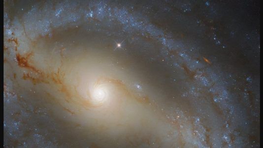 Os braços espirais preguiçosamente sinuosos da galáxia NGC 5921 serpenteiam por esta imagem do Telescópio Espacial Hubble da NASA/ESA. Esta galáxia fica a...