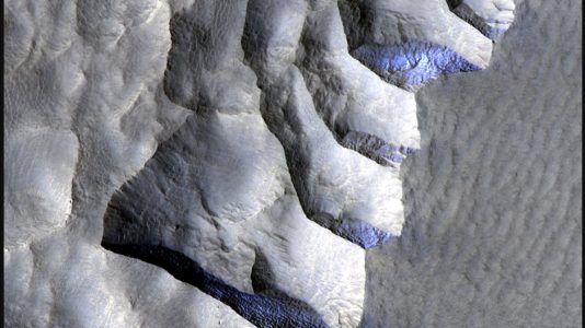 Todo inverno, uma fina camada de dióxido de carbono que lembra uma geada aqui na Terra, se forma na superfície de Marte. Em sua maior extensão no meio do inverno, essa...