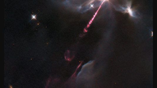 Uma explosão energética de uma estrela infantil atravessa esta imagem do Telescópio Espacial Hubble da NASA/ESA. Essa rajada de material estelar – produzida por uma...