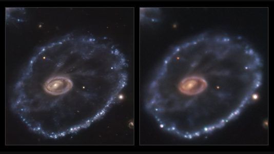 A cerca de 500 milhões de anos-luz de distância, na constelação do Escultor, encontra-se uma galáxia de aparência bastante peculiar, conhecida como a galáxia Cartwheel...