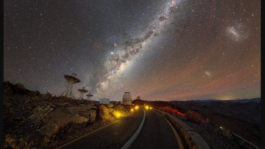 Esta bela imagem, obtida perto do telescópio dinamarquês de 1,54 metro e do telescópio de 3,6 metros do ESO na estrada que leva até La Silla, mostra a Via Láctea acima...