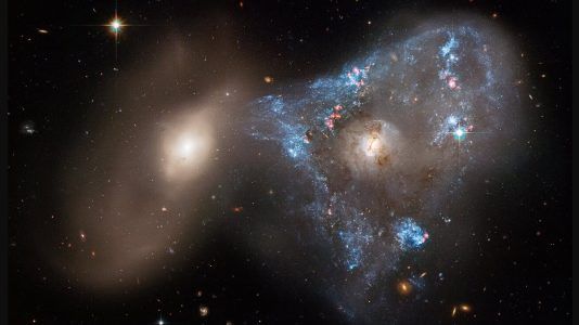 Uma colisão frontal espetacular entre duas galáxias, conhecida como Arp 143, alimentou o frenesi incomum de formação de estrelas em forma triangular, conforme capturado...
