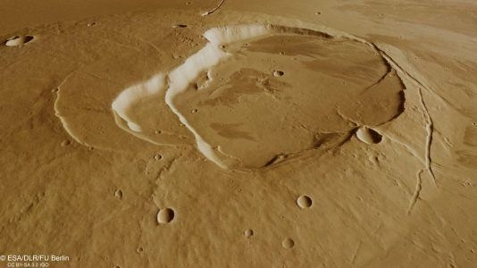 À primeira vista, duas características circulares contrastantes saltam desta cena: um vulcão que se eleva suavemente acima da superfície com um sistema de caldeira em...
