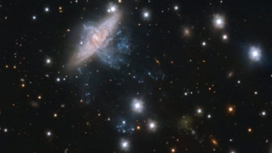 Esta imagem mostra, em cima à esquerda, um par de galáxias em espiral sobrepostas, NGC 3314a e NGC 3314b, capturadas pelo VLT Survey Telescope (VST) do ESO numa...