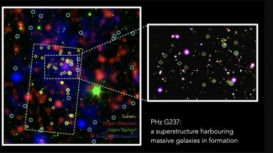 Uma equipe internacional de astrônomos relata a descoberta de objetos que parecem ser uma acumulação emergente de galáxias em formação – conhecido como um...
