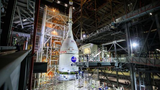 A cápsula Orion da NASA está presa no topo do poderoso foguete Space Launch System da agência, e o sistema integrado está entrando na fase final dos preparativos para um...
