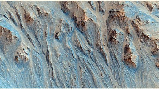 Uma imagem estereográfica dessa região, mostra que a paisagem nesta observação está amplamente erodida, até o topo das cristas, com canais que se estendem para baixo em...