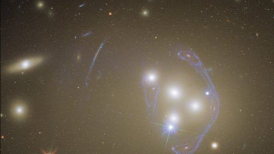 Isso é uma galáxia ou são três? À direita da imagem do Hubble do massivo aglomerado de galáxias Abell 3827 está o que parece ser uma galáxia incomum – curva e com...