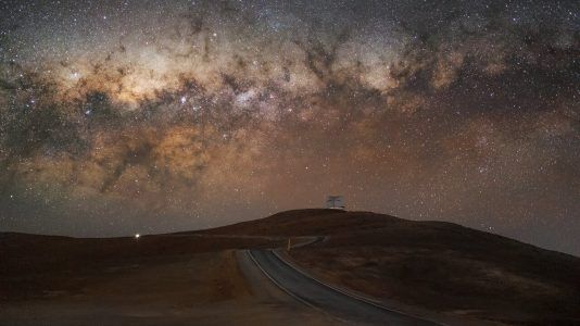 Linhas escuras cruzam o céu chileno no Observatório do Paranal do ESO, fazendo a região mais brilhante da Via Láctea brincar de esconde-esconde com o telescópio VISTA do...