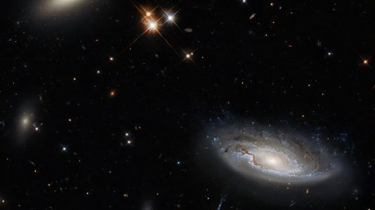 Duas coisas chamam a atenção nessa bela imagem feita pelo Telescópio Espacial Hubble, usando a Wide Field Camera 3, ou WFC3. Duas enormes galáxias que aparecem no lado...