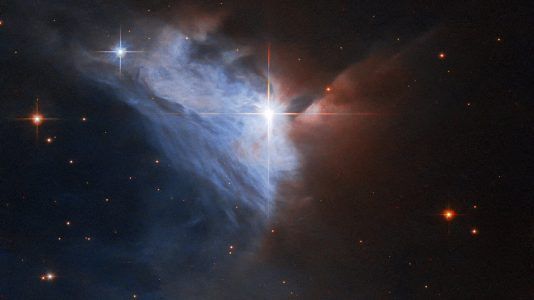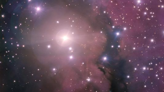 A imagem acima mostra a nebulosa de emissão NGC 2313. A estrela brilhante, V565, circundada por quatro proeminentes spikes de difração, ilumina um véu de gás e poeira...