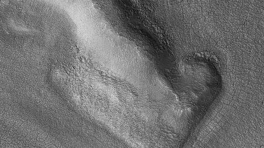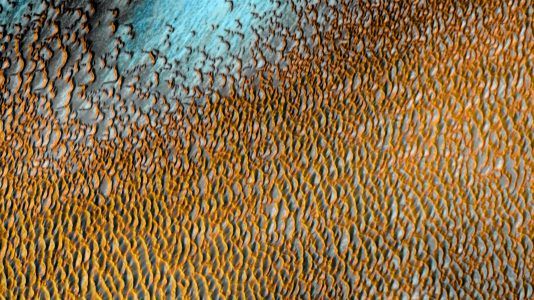 Um mar de dunas escuras, esculpida pelo vento, formando longas linhas, circundam a calota polar norte de Marte e cobre uma área maior que o estado norte-americano do...