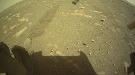 O pequeno helicóptero Ingenuity abriu seus olhos no Planeta Vermelho. Esta foto foi um teste de baixa resolução. Mostra o solo da cratera Jezero e uma parte das duas...